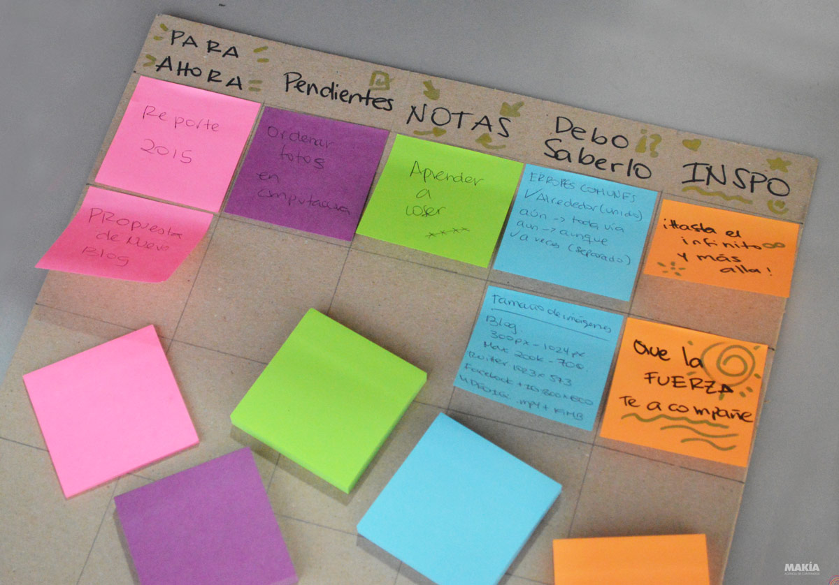Ahora ya dejarás de pegar tus notas hasta en la frente, solo deberás colorar tu tablero en un lugar muy frecuentado como frente o al lado de tu escritorio. Usa cinta doble cara para adherirlo y listo. ![]()